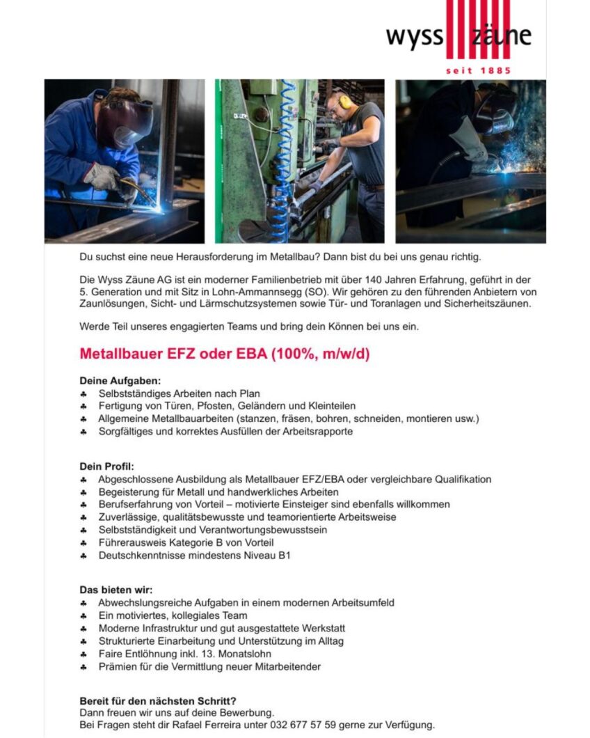 Du bist Metallbauer mit Leidenschaft und suchst eine neue Herausforderung? Dann komm zu uns ins Team der Wyss Zäune AG!