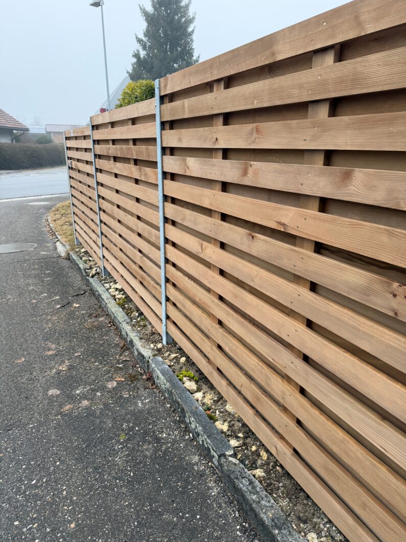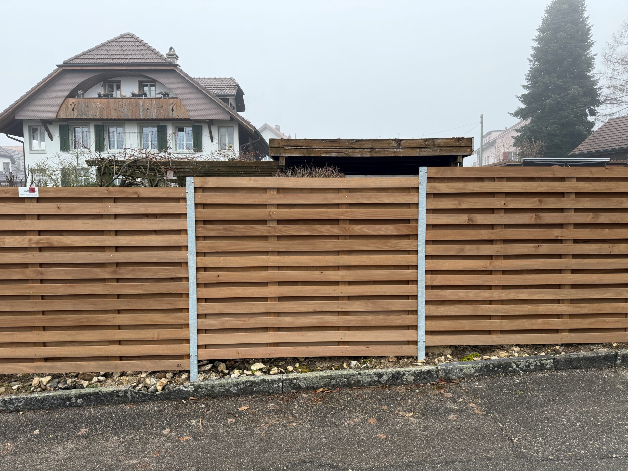 Die Lamellenwand von Wyss Zäune AG, dieses Exemplar montiert Ende 2025, wird im Gegensatz zu unseren anderen Holzwänden bereits in unserer Holzabteilung vorgefertigt.